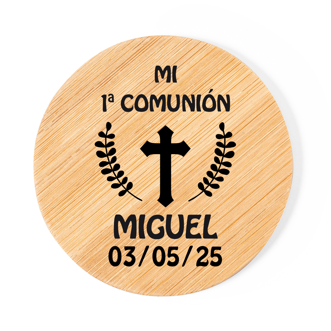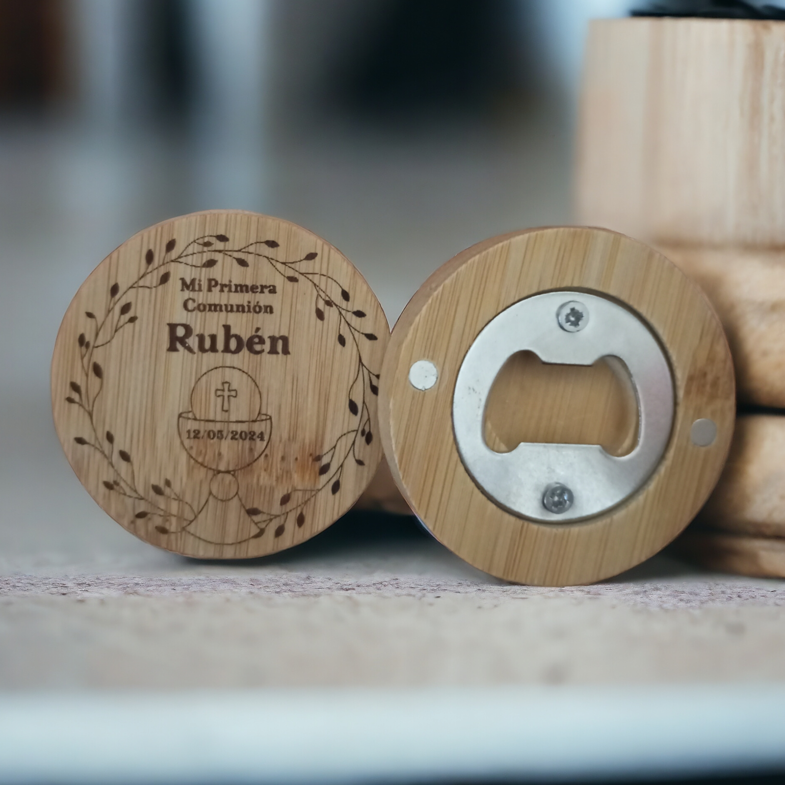 Imán abridor de bambu personalizado como detalle para los invitados a tu primera cominión.